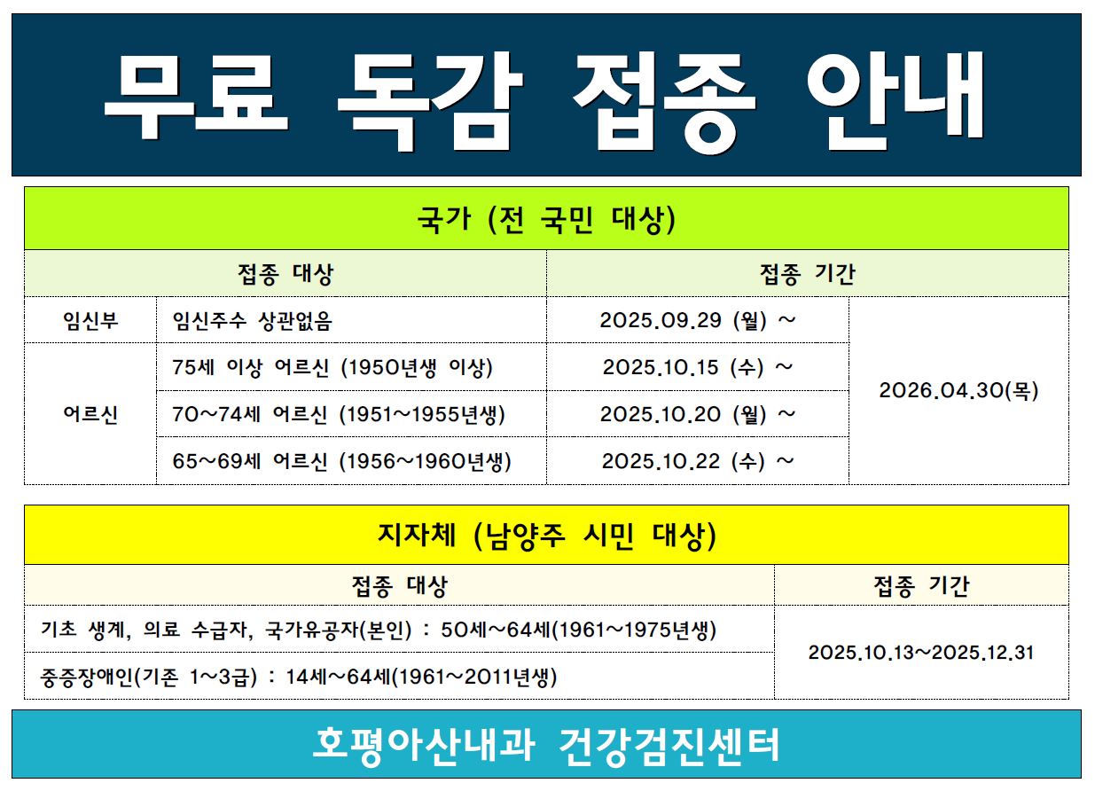 | 제목 | 2025년도 호평아산내과 무료 독감 접종 안내 | |||||||